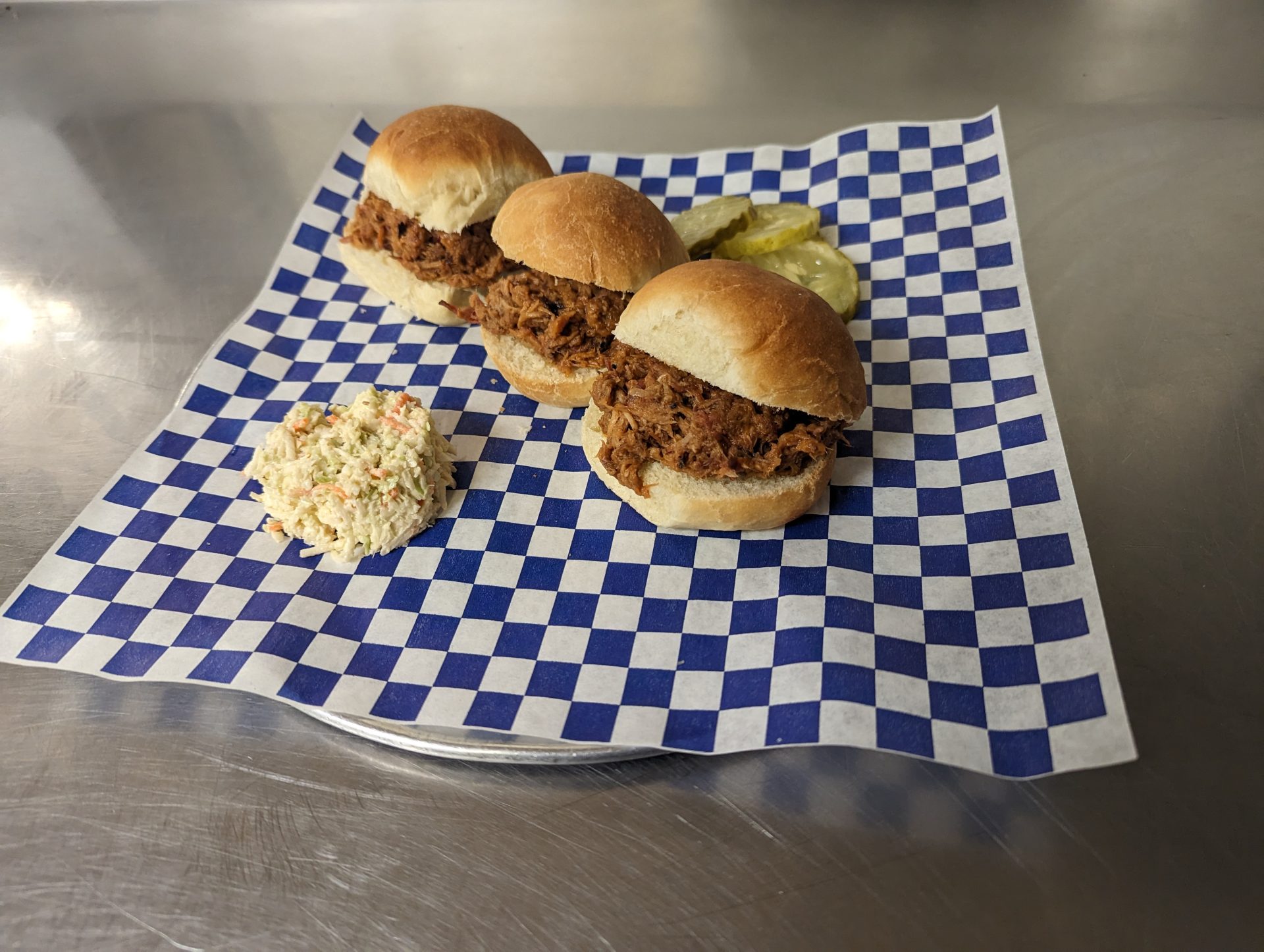 Ya’ll need to come on by and try our new ‘Three Little Piggy Sliders’. Three house smoked pulled pork sliders with home made BBQ Sauce, on fresh baked pretzel buns. Get ’em while they’re hot.